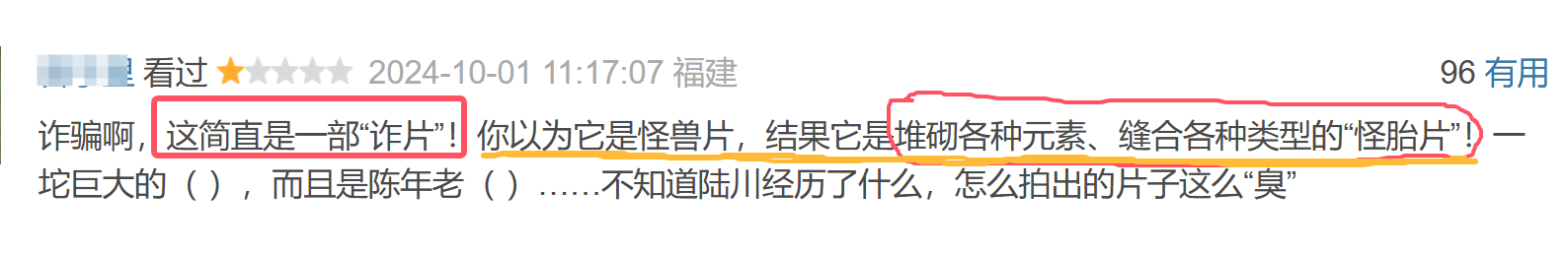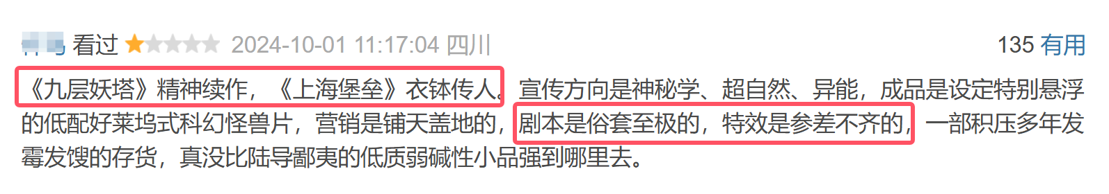 也有网友评价,该片的殊效质地杂沓不都,有的场所是五毛钱殊效。太low,满满的低价感。