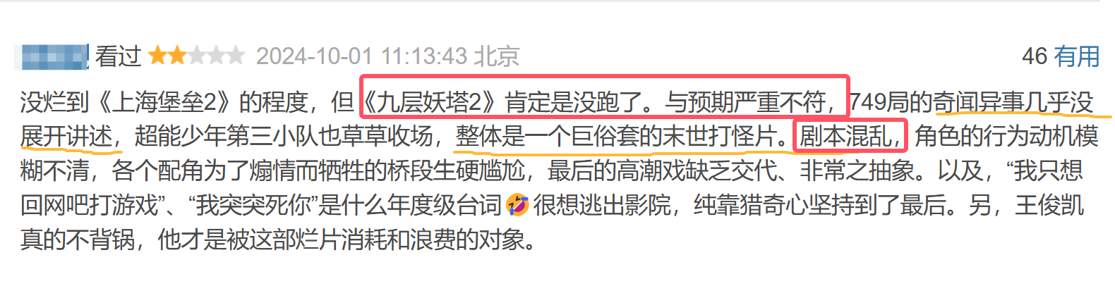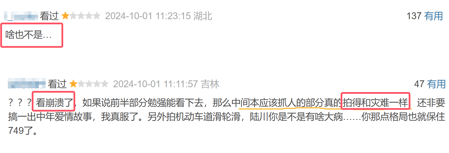 由陆川捏导并担任编剧,王俊凯领衔主演的科幻片《749局》10月1日上映,这部对于中国神秘机构749局的影片,上映前备受期待,猫眼念念看榜名循序一。 居然渴望越大,失望越大,《749局》首波评述出炉,一个字——“烂”! 年度烂片预定,“超等无敌大烂片”,“天地无敌大烂片”,“裂开了,烂中烂”! 《上海堡垒2.0》《九层妖塔2.0》,以致有网友评价该片是比《上海堡垒》更烂的科幻片。 本认为是《九层妖塔2.0》,没念念到是《九层妖塔0.2》,“八年折腾,莫得阿凡达的命,得了阿凡达的病”。 另外,网友