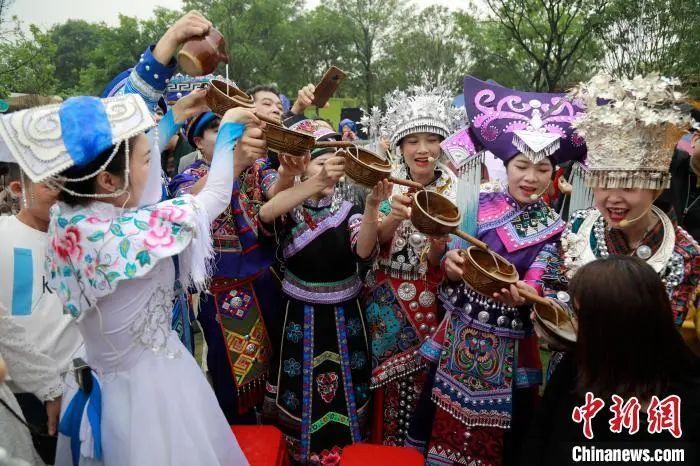 图为身穿民族衣饰的广西人人唱着敬酒歌向旅客敬酒。郭晓枫 摄