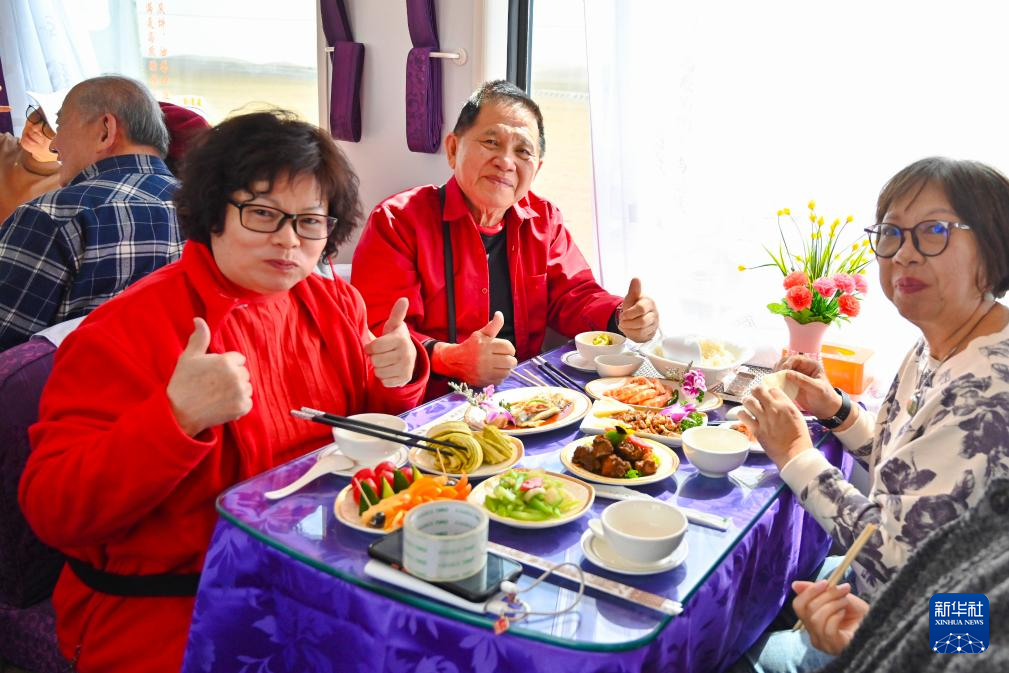 3月26日,入藏旅游专列上的游客在餐车上回味菜肴。
