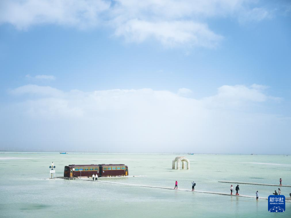 3月26日,搭乘入藏旅游专列的游客在青海茶卡盐湖景区游玩。