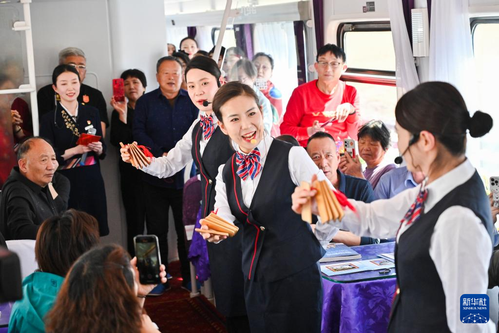 3月27日,入藏旅游专列上,由西宁客运段责任主说念主员构成的文艺小分队为游客饰演快板。