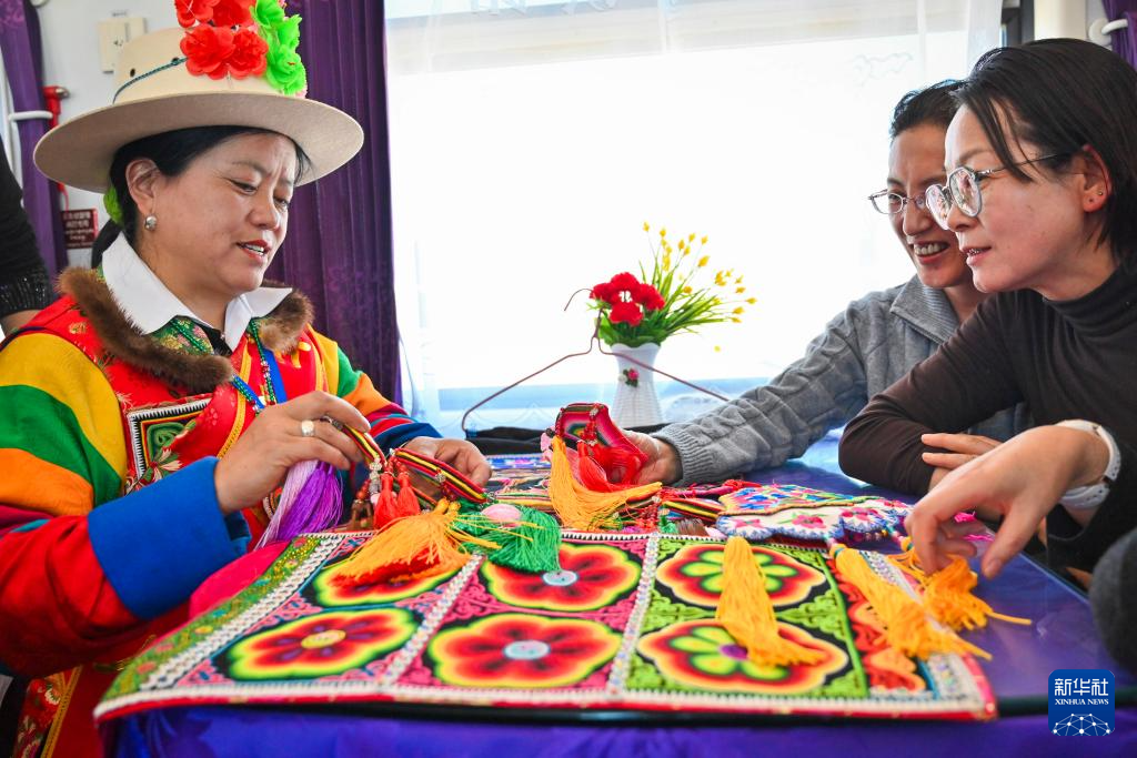 3月27日,游客在入藏旅游专列餐车非遗展台与土族盘绣传承东说念主互动疏通。