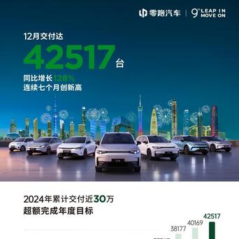 最新销量数据揭示,12月零跑汽车销量再次冲破4万台大关,委用了42517台,不竭第七个月刷新记载,稳居新势力品牌头部集团。