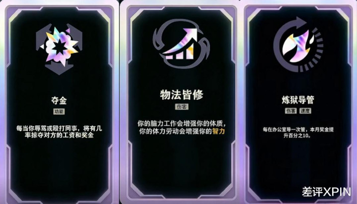 比如物法齐修:脑力责任会增强你的体质,膂力作事会增强你的才智。还有夺金:每当你瑕瑜或殴打共事,将有几率褫夺对方的工资和奖金。