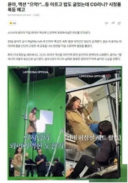 据韩国媒体8月30日报说念,允儿的官方频说念释出了tvN新剧《暴君的厨师》的拍摄幕后视频,速即引爆关怀。视频中,允儿被威亚紧紧吊起,在机内卫生间模拟舱中反复锻练空中遨游手脚,以致主动合作完成多角度旋转,专科格调拉满。