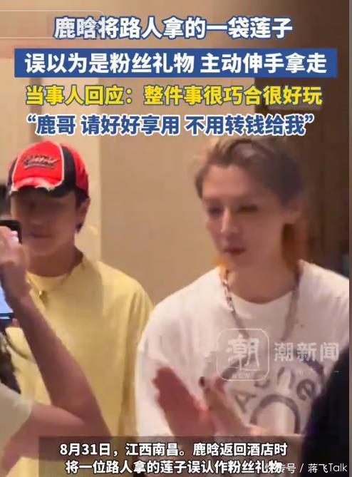 鹿晗在线下出当前,一齐上齐有粉丝围不雅和站立物。 于是当有一位路东说念主误入这个场面的时候,鹿晗以为路东说念主亦然粉丝。 还以为路东说念主手中的莲子是送给他的礼物,于是便怕粉丝伤心,见到礼物,便一直说“莲子莲子给我”。