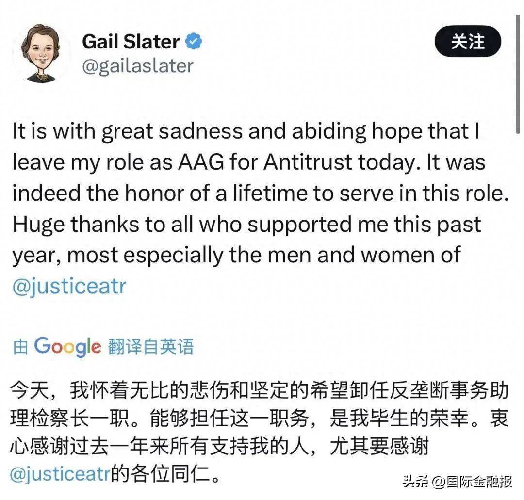 2月13日,好意思国司法部肃肃反把持事务的助理司法部长盖尔·斯莱特在酬酢平台X上发文称,我方在职仅一年后离开岗亭,“深感追到”。