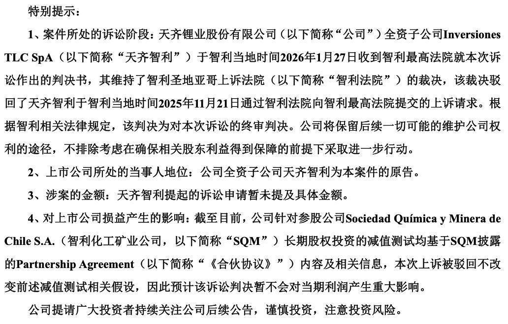 天皆锂业1月29日公告称,智利当地时辰1月27日,天皆智利收到了智利最高法院的判决书。智利最高法院驳回了天皆锂业的诉求,与此前智利金融市集委员会、智利法院的判决相易。天皆锂业在公告中默示,“后续,公司将保留一切可能存眷公司权力的路子,在确保干系鼓吹利益得到保险的前提下,不摒除选拔进一走路动。”