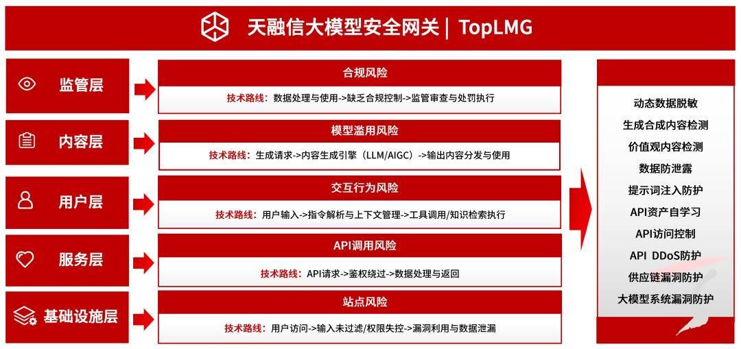 面临数据、模子、算法等层面的全新安全挑战,传统的安全器具、防护老师与应酬计策难以适配新的应用场景。天融信大模子安全网关(TopLMG)精细契合阛阓需求,迎来全面工夫升级,以硬核才气构建全链路安全防护体系,变成“识别–保护–检测–反馈–收复”的智能重视闭环,护航大模子全生命周期安全。