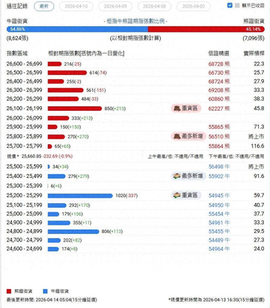 智通财经APP获悉开云kaiyun,截止4月14日,恒指最新的牛熊街货比例为55:45。 中信证券牛熊证街货散布图中的数据表示,熊证街货重货区在26100-26199区间,该区间最新熊证数目为850张,较上一走动日加多213张;熊证街货最多新增在25800-25899区间,该区间最新熊证数目为270张,较上一走动日加多270张 牛证街货重货区在25200-25299区间,该区间最新牛证数目为1020张,较上一走动日减少337张;牛证街货最多新增在25400-25499区间,该区间最新牛证数目为