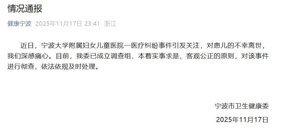 近日,宁波大学附属妇男儿童病院一医疗纠纷事件激励关切,对患儿的凄凉离世,咱们深感无语。现在,该委已配置造访组,本着粉墨登场、客不雅平允的原则,对该事件进行彻查,照章依规实时处理。