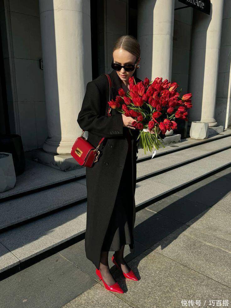玄色毛呢大衣是当之无愧的首选,用它和红色包包、鞋子搭配高等摩登,氛围感拉满,为了保证体感温度,外相一体棉服和玄色羽绒服与红色配饰搭配,不雅感也不赖。